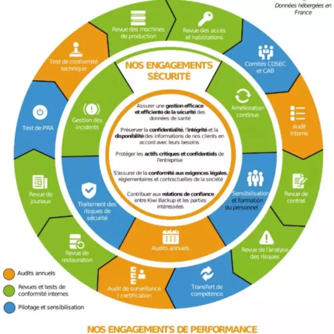 Il était important pour nous d'apporter à nos clients une bonne qualité de service et - surtout - un service sécurisé. C'est la raison pour laquelle il était important d'obtenir la certification HDS et ISO 27001. Comme vous pouvez le constater sur l'infographie, nos engagements sécurité sont nombreux.